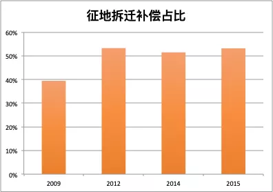 按照財政部的口徑,徵地拆遷補償,支付破產或改制企業職工安置費用和土地開發被列入土地出讓的“成本性支出”。這個成本性支出的佔比在2009年約為60%,2011年為70%,2012,14,15年均接近80%。