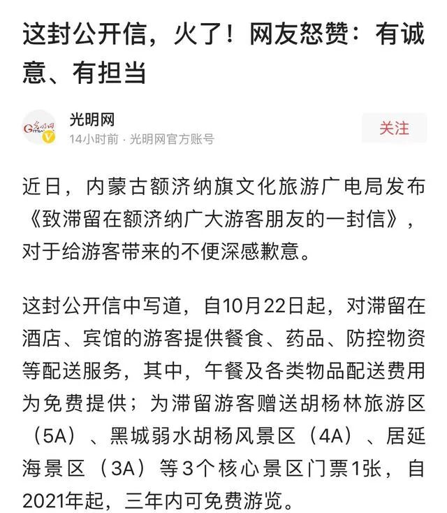 10月21日,額濟納旗文化旅遊廣電局發佈了一封致歉信,表示將贈送滯留遊客每人1張免費3年的門票,包含胡楊林旅遊區(5A)、黑城弱水胡楊風景區(4A)、居延海景區(3A)。