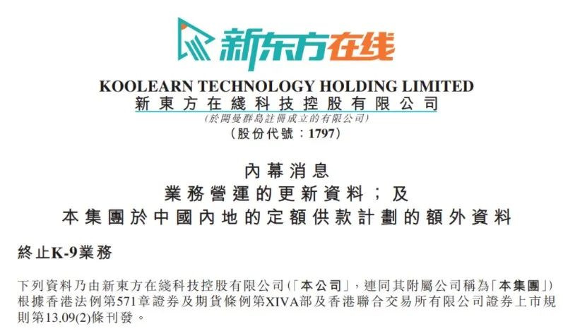 10月25日晚間,新東方在線發佈公告稱,根據新規定及為確保本集團及其營運完全遵守所有適用的法律和監管要求,本公司董事會已決定,本集團將停止經營中國內地義務教育階段學科類校外培訓服務,其乃提供予中國內地幼兒園至九年級(K-9或義務教育)的學生。終止預計於2021年11月末之前生效。