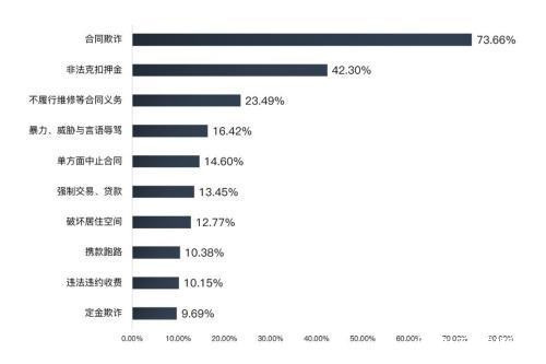 當年,看房狗發佈的另一組數據,有877名租房人對黑中介行騙手段進行了投票選擇,數據顯示合同欺詐是最常用的手段,佔比73.66%,其後的非法剋扣押金佔比42.3%。