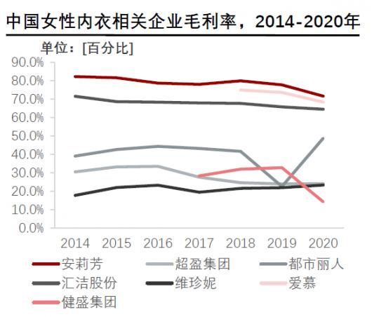 事實上,女性內衣行業的毛利率普遍較高,產品單價較高的中高端內衣品牌安莉芳、匯潔股份和愛慕過去6年的平均毛利率平均為78.6% 、67.8% 和72.3% ,而業內相關人士估計,無尺碼內衣的毛利率甚至能達到85%-90%。