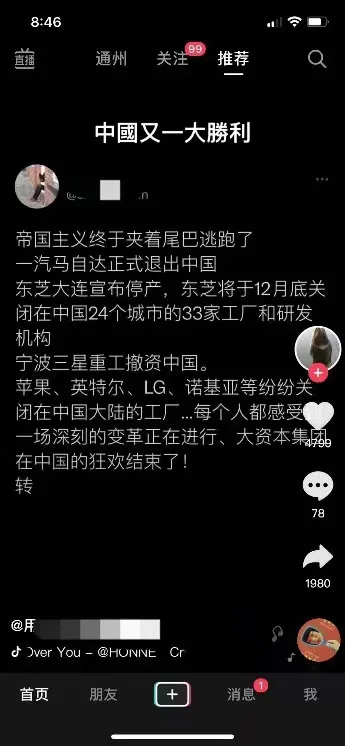這些推送的賬號有些共性:好鬥引戰,故意製造某些族羣間、性別間對立;無腦吹,不顧事實,在中國做得有所成就的領域,硬吹西方優越性,或者篡改歷史的歷史虛無主義。
