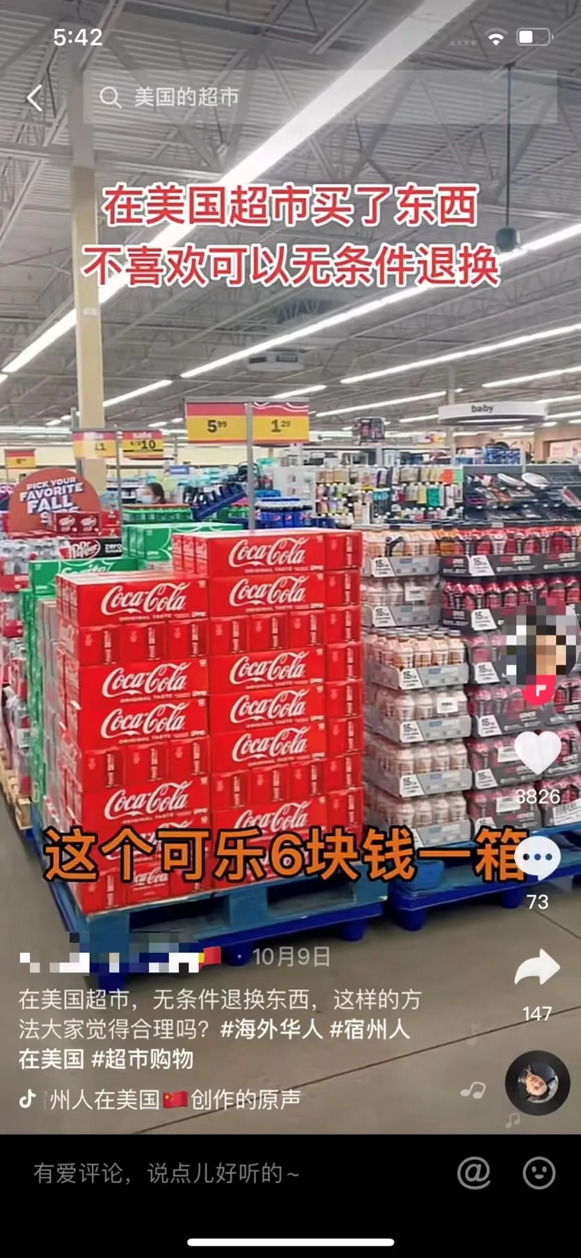 然而,在抖音的一些賬號上,你會看到一個不一樣的“美國”——街上只有極少數人戴口罩,可以放心的玩,肯德基生意興隆,超市琳琅滿目,可樂只要6塊錢一箱。