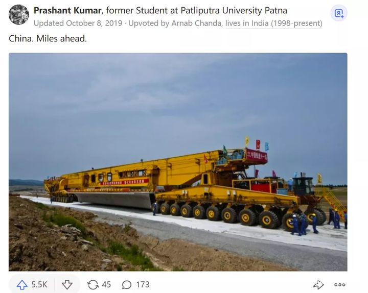 印度網民Prashant Kumar的認慫回答,不僅沒有激起印度人的民族主義和不服輸的精神,反而被5500+贊頂到所有答案的第一位。