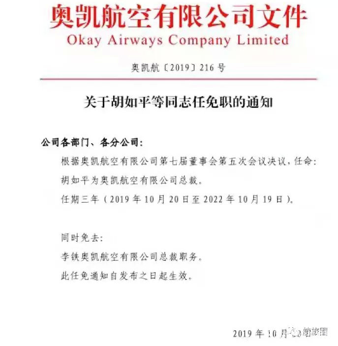 不過,李鐵並沒有在奧凱航空留任多久。2019年10月,曾擔任東海航空副總負責營銷的胡如平,空降奧凱航空總裁,並在隨後幾個月陸續成為奧凱航空的法定代表人和董事長。回顧:奧凱總裁換人,央企華電集團介入