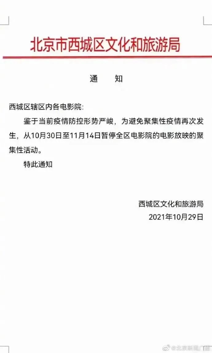 今天上午,北京西城區文旅局發佈通知,從10月30日至11月14日暫停全區電影院的電影放映的聚集性活動。