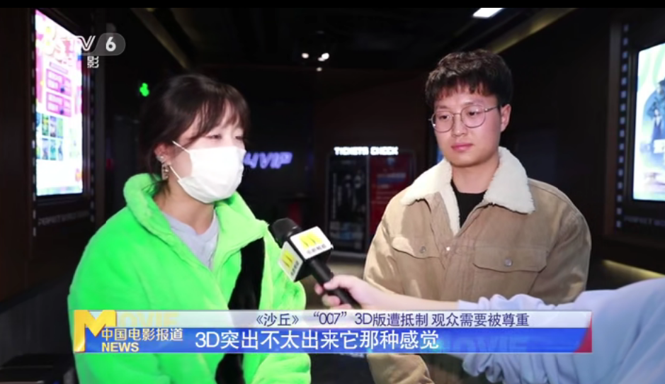 北京完美世界影城經理對於為什麼《沙丘》和《007》排了這麼多3D是這樣解釋的:“發行方會提供很多個版本,取捨的話是由影院取捨的,像我們這家影院的話體量比較小,再加上《長津湖》佔了2D的排場,更多時候我們依然會排3D為主,會少數穿插那麼個一兩場2D場次。”