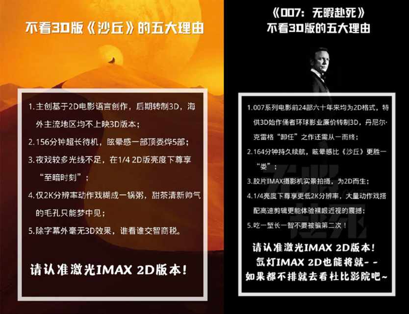 下面這個就是網上流傳的抵制圖,網友總結出了不看3D版《沙丘》的五大理由和《007:無暇赴死》不看3D版的五大理由,並呼籲觀眾認準IMAX 2D版本。從圖中可以看出,網友們抵制的核心在於“後期轉制3D”。