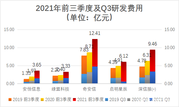 本次財報季,各公司也同時公佈了自己在研發方面的投入,從2021年前三季度研發費用的增長幅度上可以看出,一個比一個狠:安恆信息比去年同期增長了85.28%,研發費用總額首次超過綠盟科技;綠盟科技增長了38.75%,奇安信增長了42.48%,啓明星辰增長了24.64%,深信服增長了49.76%。