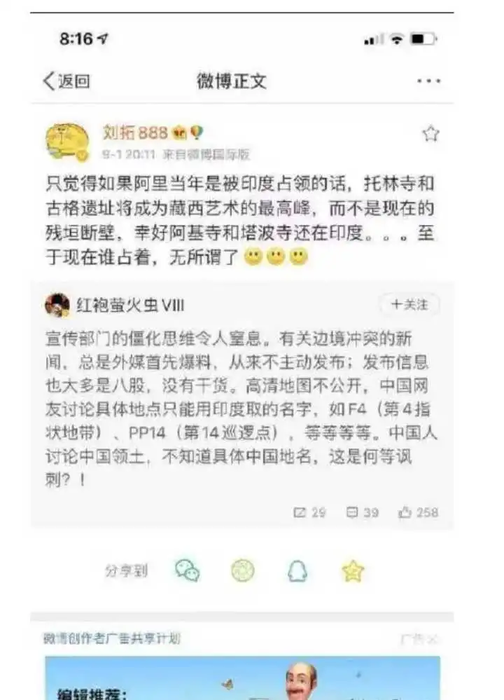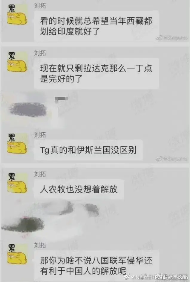 有些人復讀機一樣反覆説要考慮“劉拓在什麼語境下説的話”,笑死我了,他都要把阿里地區劃給印度了,他都妄圖分裂國家了,我還要考慮他説話的“語境”?