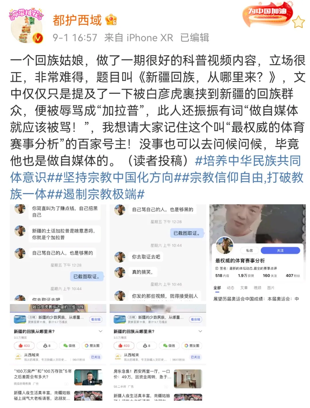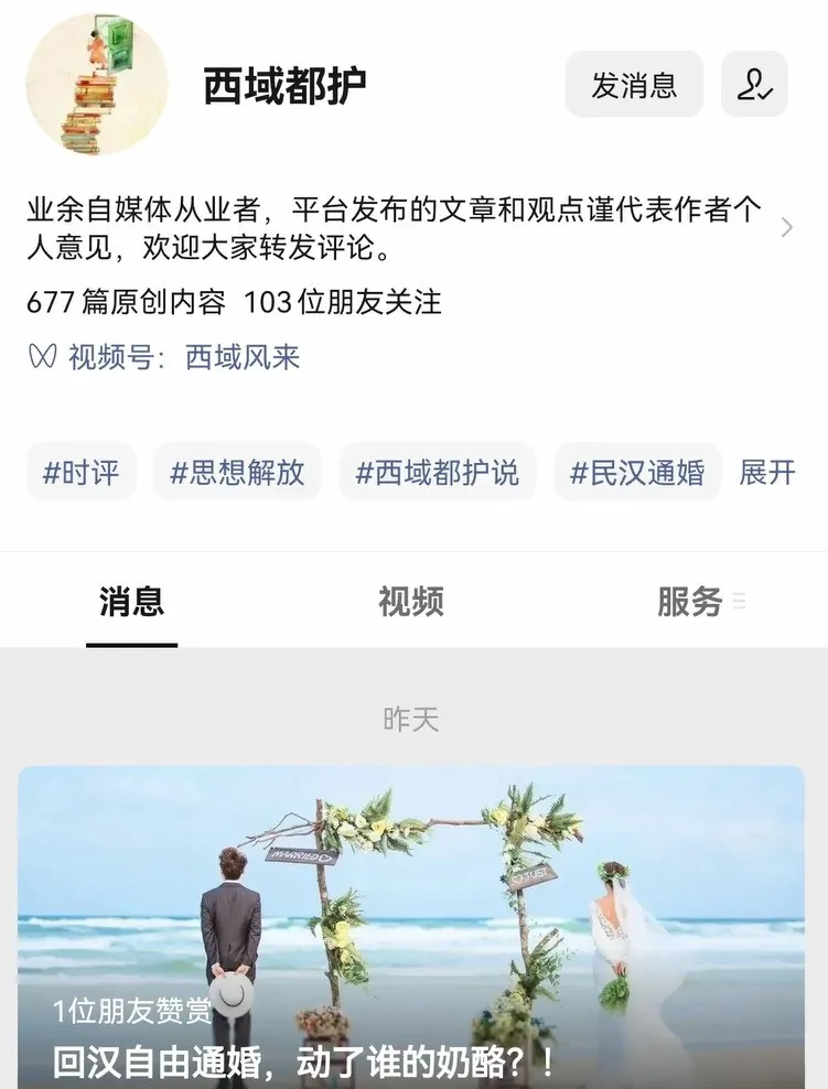 同樣的場面發生在我的朋友都護君身上。TA的公眾號西域都護和微博都護西域因為關注民族宗教問題,所以會發布一些涉及反恐、去極端化方面的文章,我和一眾小夥伴經常為之寫些豆腐塊。