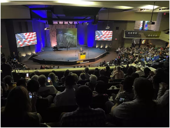 推文的配圖中,一張照片是他和餘茂春與“香港自由燈塔”創辦人的合影,另一張是他在現場演講的照片,會場後懸掛着美國國旗和“光復香港、時代革命”的標語。