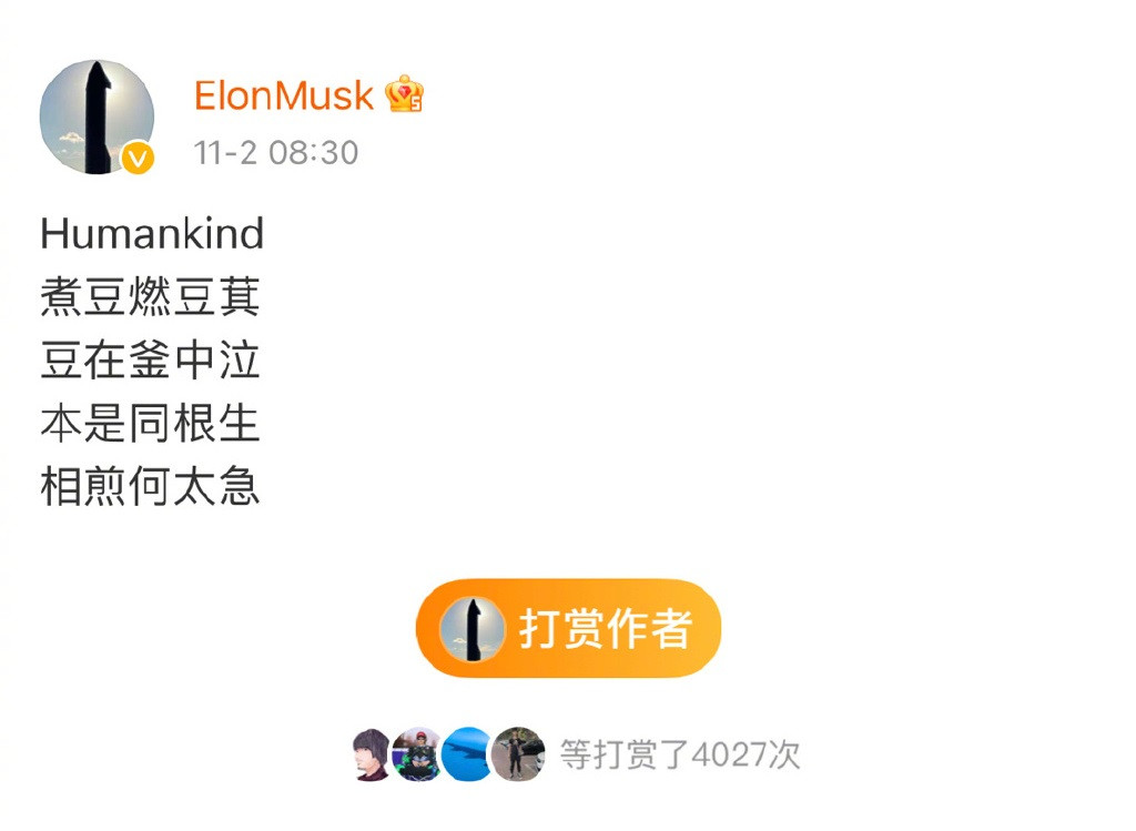 早上,馬斯克在推特上用漢文發了一首中國漢魏時期大詩人曹植的《七步詩》:“煮豆燃豆萁,豆在釜中泣。本是同根生,相煎何太急。”並同步更新到新浪微博上。不少中國網友驚呼此乃中華文化輸出的重大成果,也在紛紛猜測馬斯克引用此詩有何寓意。