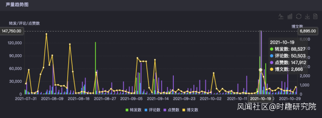 牽手劉昊然的完美日記能否繼續實現品牌升級,目前還並不好説。但在代言人官宣之後,完美日記確實獲得了不少大眾聲量和熱度的討論。根據時趣極速洞察引擎對完美日記的數據分析,可以發現完美日記在官宣的聲音中的社交熱度呈現攀升峯值。