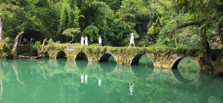 第一天初入景區,我們發現這裏的山、水、湖只有一種顏色——大自然綠,難怪會被稱為地球上的綠寶石。河面幽幽泛着綠光,與倒映的小七孔橋,形成了一副絕美的風光圖,但橋上人來人往的遊客卻顯得有些突兀。