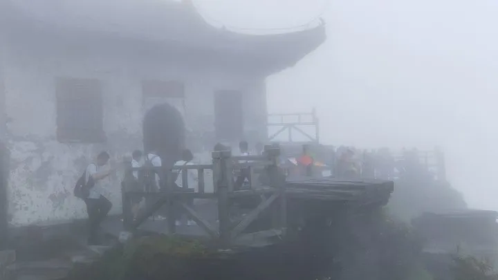 登頂之後,你會深刻理解什麼叫“不識廬山真面目,只緣身在此山中”,目之所及就是兩座小神殿,根本體會不到網上航拍視頻帶來的震撼感(現在也禁止放無人機航拍)。更倒黴的是,天公不作美,濃霧也斷了我們登高望遠的念頭,只好帶着遺憾從另一邊下了山。