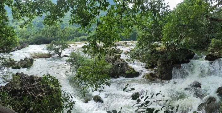 天星洞出來後,又要沿着河邊棧道走很長一段路,才能到達天星橋最精華景點——水上石林,洶湧澎湃的水流不停地衝擊着河中大大小小的石頭,發出轟隆隆的巨響,猶如千軍萬馬衝向銀鍊墜潭瀑布。