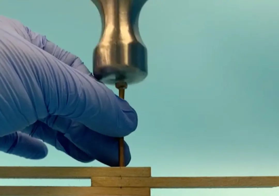 研究人員演示用硬化木釘釘木板丨圖片來源:Bo Chen