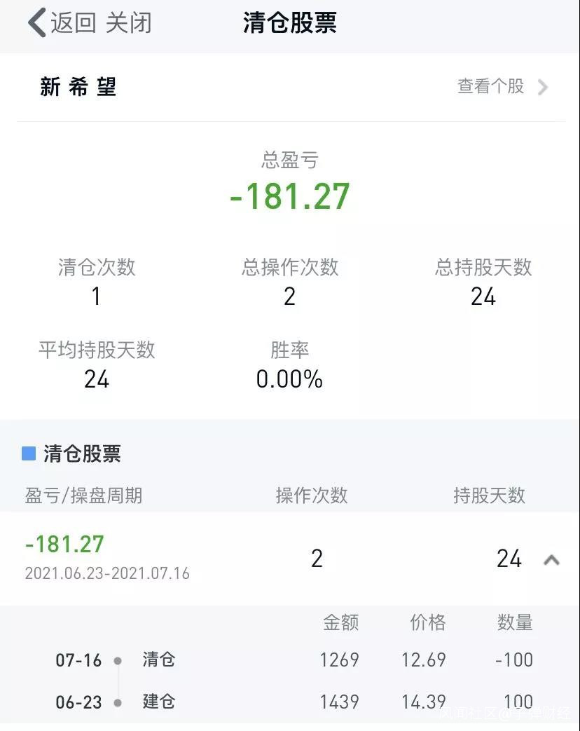 但她買完新希望後,觀察了20多天,發現這個股票不大漲也不大跌,“就是死氣沉沉的,我也沒啥加倉的想法和機會,但我實在是沒耐心等,感覺還是買新能源等比較熱點的板塊刺激,就虧一百多塊錢清倉了。再看現在新希望的股價,我覺得當時沒加倉而是選擇清倉特別明智,這種股票可能還是適合炒長線的買。”