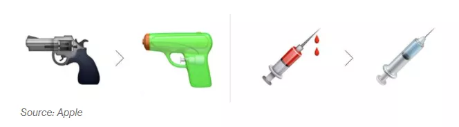 一些平台為了適應不斷變化的時代,也修改了表情符號的設計。例如,在2016年,蘋果公司的“槍”表情符號變成了水槍,其他表情符號系統也紛紛效仿,在2020年,由於數百萬人正在接種新冠疫苗,“注射器”表情符號被重新繪製,消除了原有的血液。