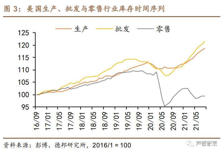 運力問題的另一個結果就是,在生產有序恢復的情況下,美國的庫存呈現出生產>批發>零售的現象。一來,生產有序恢復使得生產商的庫存逐步恢復至疫情前的線性外推水平;二來,運力瓶頸使得商品無法從生產向批發、再向銷售進行有效傳導,使得庫存大量堆積在生產端,而零售端庫存則因上游受限、下游需求旺盛而被快速消耗。
