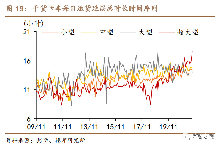 而由於集裝箱在港口無法完成有效卸貨,導致部分商品無法從進口商或者批發商處有效地向下傳導,使得缺運力的問題進一步演化成缺貨的問題。對於乾貨卡車而言,體型越大,意味着缺貨的概率越大,即運貨的停留與延誤時長越大。這進而加劇了貨物從進口商或批發商向下遊的交付時間與客户庫存的減少。