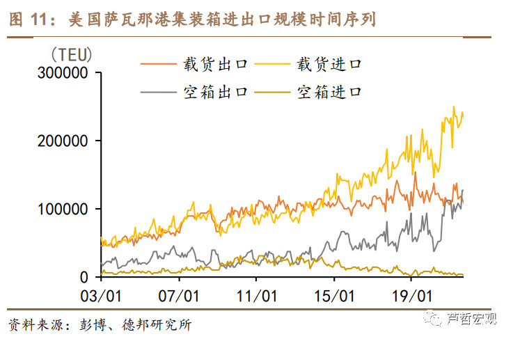 如果載貨進口規模的激增是集裝箱瓶頸的原因,那麼空箱出口規模的激增則是集裝箱瓶頸的結果。因為貨運場的飽和開始倒逼港口儘可能多地去出口空載集裝箱,以緩解集裝箱的倉儲壓力。追蹤數據顯示,載貨進口與空箱出口雙高的現象確實存在於部分美國港口,由此可刻畫出這些港口的集裝箱倉儲面臨飽和。