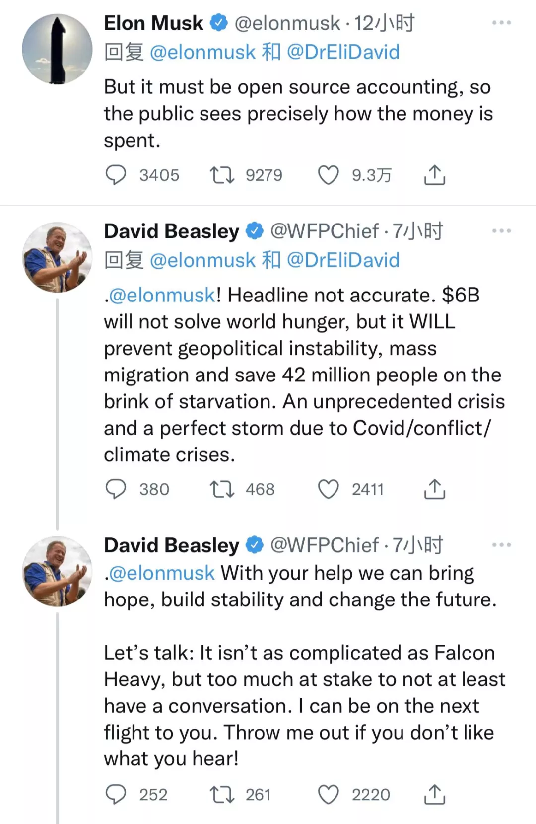 而在更早些時候,馬斯克還被cue捐款。聯合國一位官員公開呼籲 ,只要全球首富、特斯拉首席執行官馬斯克捐出總所得2%,約為60億美元,就可幫助全球免於饑荒。