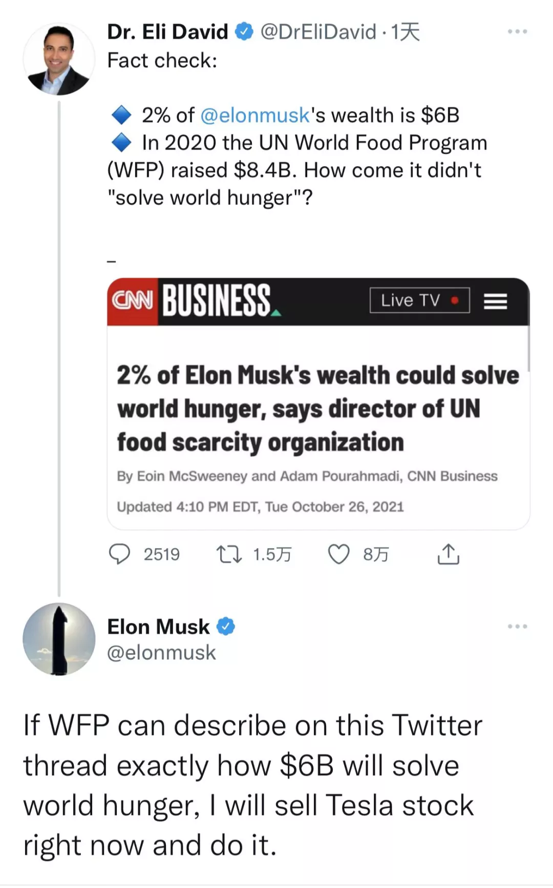 馬斯克在推特上寫道:“如果世界糧食計劃署能夠在這個推特帖子上準確描述 60億美元將如何解決世界飢餓問題,我將立即出售特斯拉股票來捐贈。但它必須是公開透明的會計方法,讓公眾可以準確地看到錢是如何花的。”