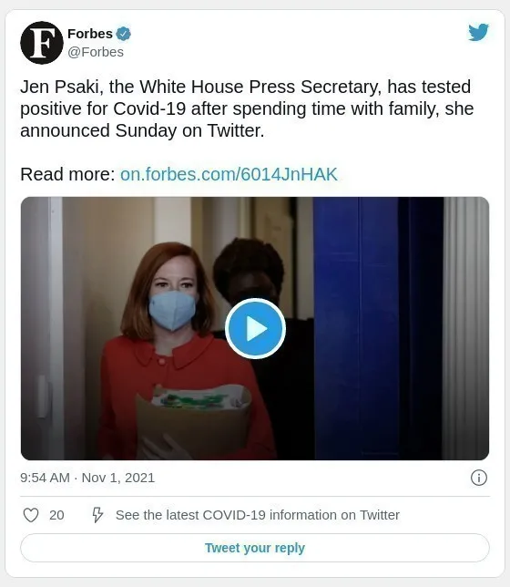 42歲的Jen Psaki説,她接種了疫苗,症狀輕微。她説,星期二她與拜登坐在室外,相隔6英尺(1.8米)以上,戴了口罩。一位知情人士説,拜登週六的新冠檢測結果為陰性。