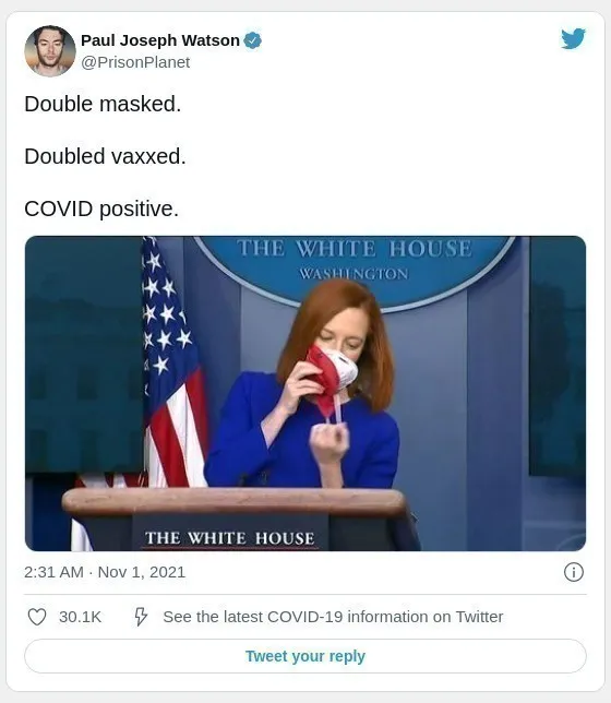 重磅新聞來一條,據各家大媒體綜合報道,美國拜登政府白宮發言人Jen Psaki在一份聲明中説,**她10月31日的新冠病毒檢測呈陽性。**她表示她上一次見到拜登總統是在10月26日。
