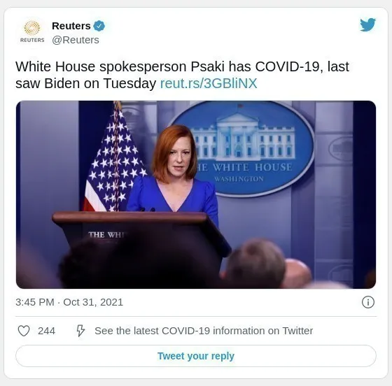 Jen Psaki是白宮首席發言人,**是拜登一月上台以來其政府團隊中感染新冠病毒的最知名的人物。**Jen Psaki説,她決定不參加拜登本週的羅馬和格拉斯哥之行,因為她的一位家庭成員新冠檢測出陽性,隨後她本人進行了隔離。