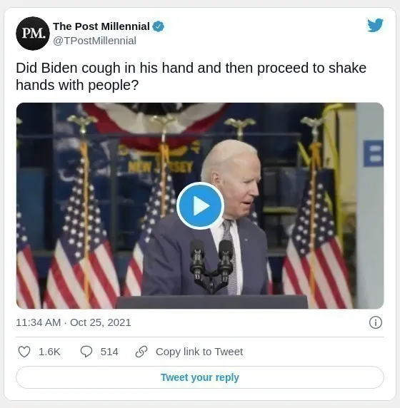 除此之外,媒體報道説,星期一時,拜登在新澤西州發表演講後,沒有戴口罩,用手遮掩咳嗽,並用那隻手和很多人握手。