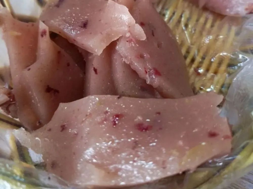 河北定州,當地人把瘦肉絞成小塊(可不能完全絞成肉泥),放到紅薯澱粉糊中一起熬煮、結塊、過涼水、曬乾,最後再經過一道熏製。
