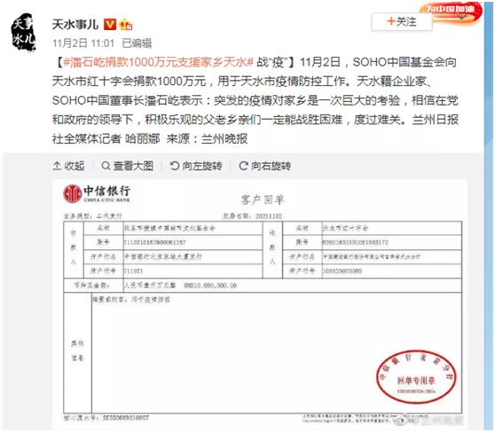 “天水事兒”發出的貼文中,除了有關捐款的消息外,還介紹道天水籍企業家、SOHO中國董事長潘石屹表示:突發的疫情對家鄉是一次巨大的考驗,相信在黨和政府的領導下,積極樂觀的父老鄉親們一定能戰勝困難,度過難關。