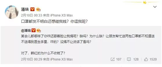 潘石屹沒補捐也沒吱聲,只是關閉了自己的微博評論。但他的大兒子潘瑞出來説話了:“口罩都發不明白還想碰我錢?”