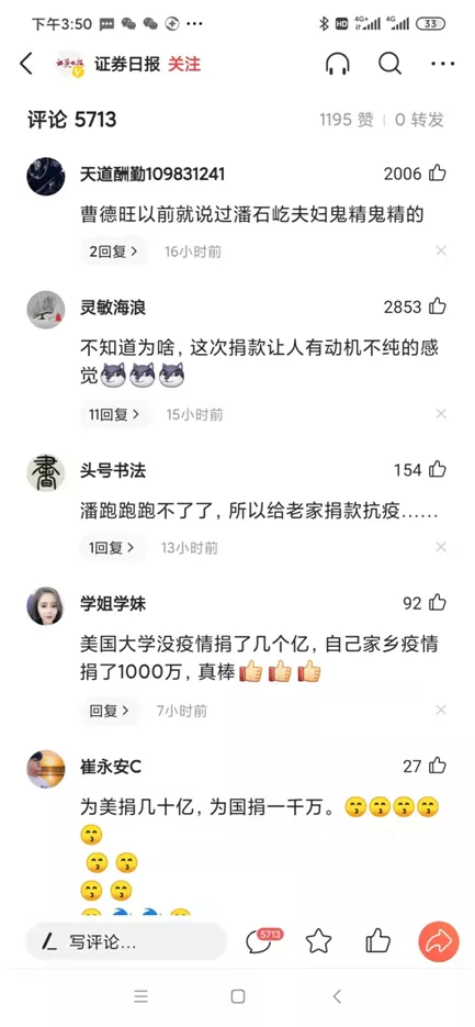 比如,一位網友留言:雖然我不喜歡潘石屹,但現在捐款確實是雪中送炭,不過想通過花錢扭轉自己的形象,反正也挺難。