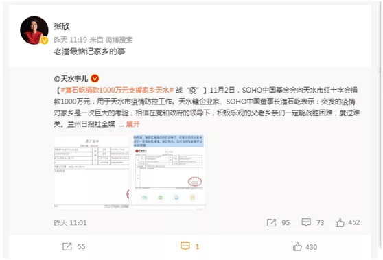 作為潘石屹的夫人,張欣在新浪微博上粉絲達到1024.1萬,但是也沒有直接發佈這個消息,而是在11月2日中午轉發了天水當地的一個用户“天水事兒”的消息,然後留下了一句簡單的轉評:老潘最惦記家鄉的事。