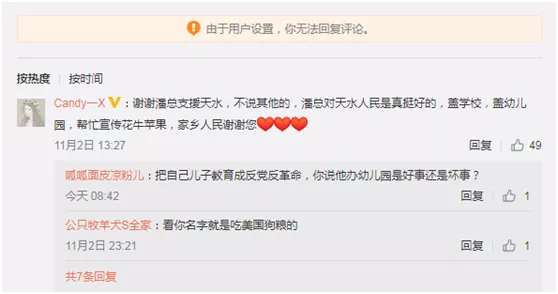 在這條微博貼文下能夠看到評論回覆已經被限制,其中一些天水的網友對潘的舉動持讚揚態度。