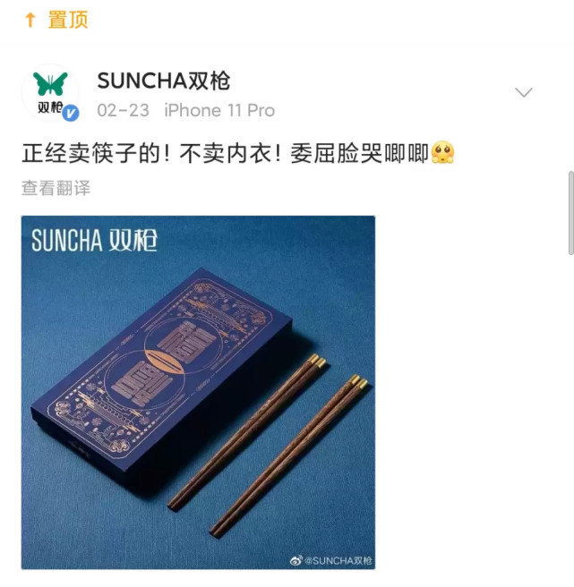 也就是説,儘管此時的雙槍科技佔據市場龍頭地位,但至今人們對其品牌認知還處於初級階段。雙槍科技置頂微博的一賣萌式吐槽也印證了這一觀點:“正經賣筷子!不賣內衣!委屈臉哭唧唧。”