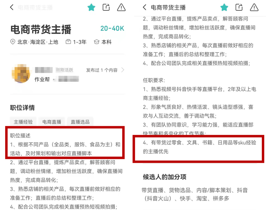 職位描述第1條提到:根據不同產品(全品類,服飾、食品為主)和活動,及時策劃和輸出對應直播腳本。任職要求第4條再次強調:有帶貨過零食、文具、書籍、日用品等sku經驗的主播優先。