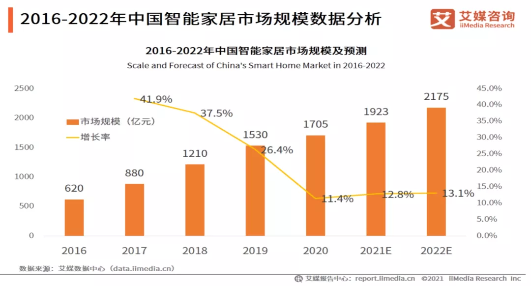 當前家電市場遊戲規則已經改變,如果仍依賴傳統增長思路,註定被淘汰。而逆襲的關鍵點,正是5G、AI、物聯網時代下的智能家居市場。艾媒諮詢數據顯示,2022年中國智能家居市場規模到將達2175億元。