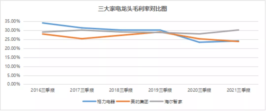 從毛利率水平來看,前三季度格力電器為24.13%,美的集團23.8%,自2016年以來不斷探底。海爾智家毛利率水平為30.21%,創出近5年新高。