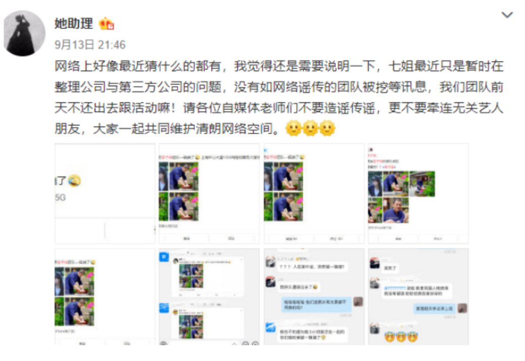 李子柒的助理解釋説,團隊沒有被挖走,停更只是因為李子柒在處理“公司和第三方公司的問題”: