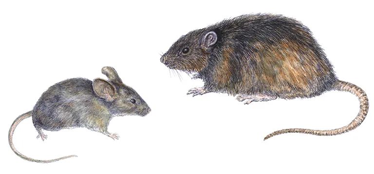 從外觀上看,小鼠耳朵比較大,尾巴比較細且帶毛。大鼠耳朵比較小,尾巴又粗又無毛。