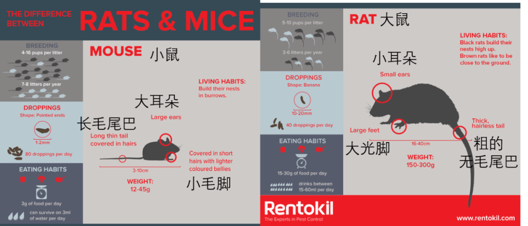 還有一種老鼠是大鼠,英文叫rat,屬於齧齒目 Rodentia, 鼠科 Eumuroida,大鼠屬 Rattus,褐家鼠種 R. norvegicus。