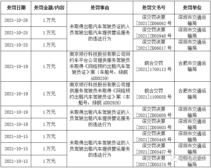 **企查查數據顯示,剛剛過去的10月份,T3出行共遭遇10次行政處罰,處罰事由均未取得“網絡預約出租汽車駕駛員證”,每次罰款1萬元,合計被罰10萬元。**其中,8次由深圳市交通運輸局作出處罰,2次由合肥市交通運輸局作出處罰。