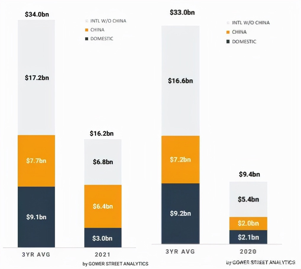 雖然這個數據不及疫情前平均340億美元的成績,但是已經相比2020年同期94億美元票房增長達到72%。在這162億美元中,中國市場恢復最快,取得了64億美元的成績,相比往年恢復程度已經達到83.1%。而除北美和中國以外其他市場,也貢獻了68億美元的票房成績。