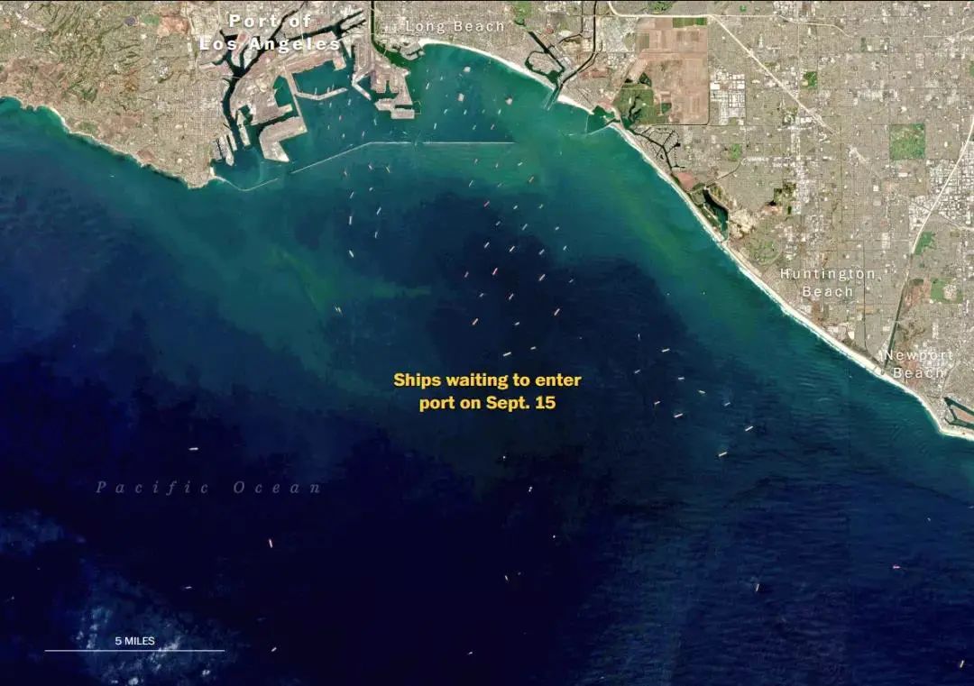 目前,在這兩個港口外等待進港的遠洋巨輪數量已經超過80艘(在疫情前,供應鏈運轉順利的時候,這兩個港口等待進港的貨輪數量最多1艘)。