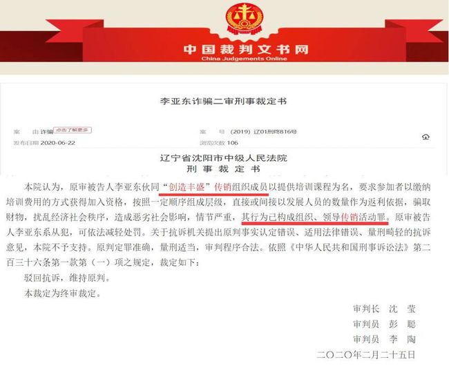 瀋陽市中級人民法院2020年2月25日(2019)遼01刑終816號判決書認為,李亞東夥同“創造豐盛”傳銷組織成員以提供培訓課程為名,要求參加者以繳納培訓費用的方式獲得加入資格,按照一定順序組成層級,直接或間接以發展人員的數量作為返利依據,騙取財物,擾亂經濟社會秩序,造成惡劣社會影響,情節嚴重,其行為已構成組織、領導傳銷活動罪。
